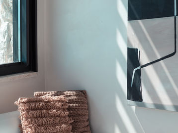 White cement and limewash covers all the surfaces, creating a cave-like atmospere buried in the slope. Wood, and rattan and black metal are other primary materials of the project, creating a contrast between old and new, rawness and fineness.